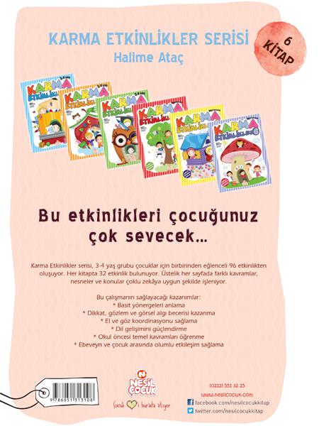 Karma Etkinlikler serisi, 3-4 yaş grubu çocuklar için birbirinden eğlenceli 96 etkinlikten oluşuyor. Her kitapta 32 etkinlik bulunuyor. Üstelik her sayfada farklı kavramlar, nesneler ve konular çoklu zekâya uygun şekilde işleniyor.